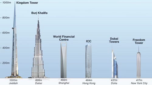 Behold the proposed new Kingdom Tower for Jeddah, Saudi Arabia — at one full kilometer in height, about twice the size of New York’s new Freedom Tower. The Kingdom Tower comprises 252 floors of mixed market apartments, hotel rooms, and offices. It is an axiom that imperial societies build their greatest monuments just before they collapse, so consider this a portent for the oil empire of Saudi Arabia. There will always be an Arabia — well something will occupy that desolate region — but it may not be the private domain of the Saud clan much longer, especially as war breaks out across the Middle East and Persia.