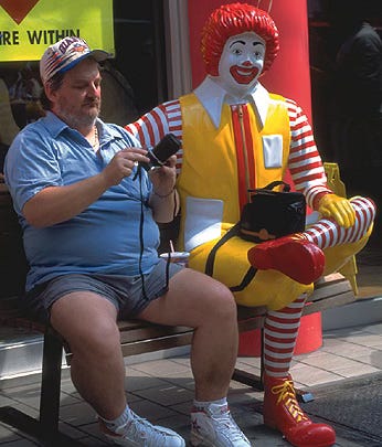 The Father of All Clowns communes with one of his many overfed American sons in front of pop's place of business. Looks like Sonny is working up a nice case of arteriosclerosis while he learns to operate his latest plaything. Notice that Sonny's costume is what used to be considered appropriate for children age six and under.