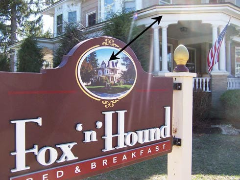 Okay, Help me out here, because this just surpasses ordinary understanding. Why is it necessary for the sign to depict a photographic image of the building right behind it? What could possibly be the reasoning here? Are signmakers nowadays too inept to paint pictures of animals -- like a fox and hound? Was this done simply because it could be done -- because the signmaker had acquired some new equipment for making photographic transfers? But most perplexing, what does this say about the American mind generally? Have we become utterly lost in self-referential thinking? I honestly don't get it.
