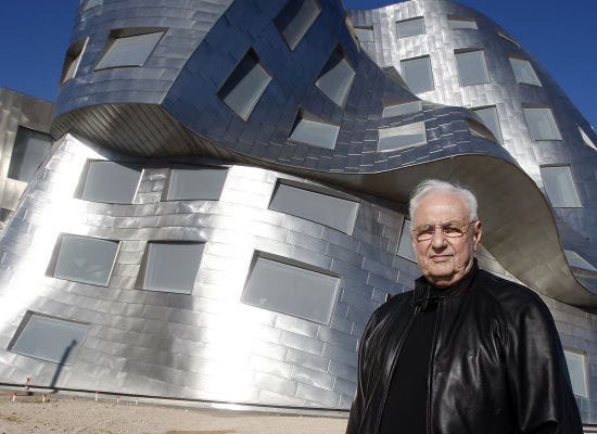 A perennial favorite here at EOTM, architect Frank Gehry poses in front of his latest tortured building, the Las Vegas branch of the Cleveland Clinic's Lou Ruvo Brain Health building, a real masterpiece of irony, insofar as it seems to say, "...this is your brain on Frank Gehry...." If I had a problem with my brain, I would not be reassured arriving at this place. The implicit sadism is impressive.