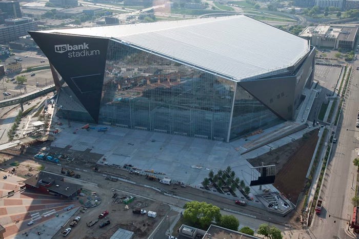 It’s a nice addition to the concrete wasteland of car storage that downtown Minneapolis has become. Note the depopulated street scene depicted below, with elevated walkways from the giant parking structure across the street. I predict that ten years from now there will be no more NFL as the oil-and-gas crisis really starts to bite. Malinvestments R Us. Go Vikes!