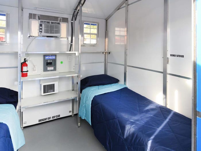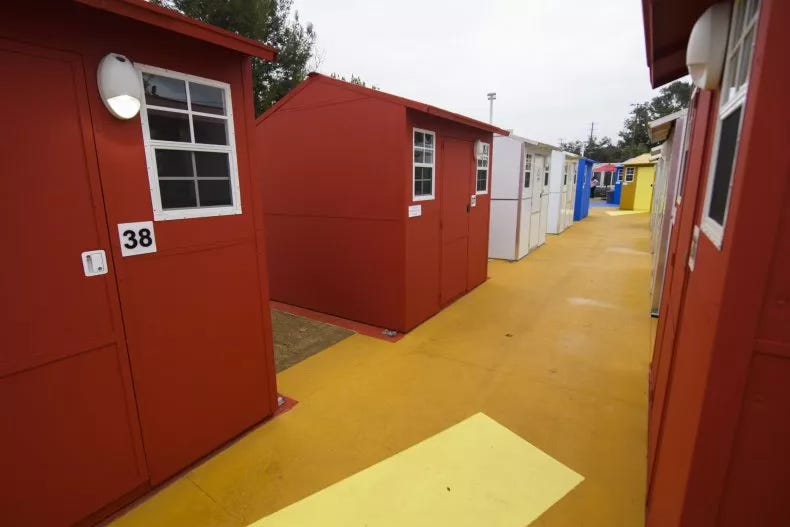 Behold: the 39-unit Chandler Boulevard Bridge Home Village, designed by Lehrer Architects with the Los Angeles’ Bureau of Engineering. Each tiny home is 64 square feet, about eight by eight feet, and comes with two beds, a heater, air conditioner, and a charging station for phones and devices. Toilets, showers and laundry available in a service pod at the far end of the village. Looks pretty inviting if you’ve been living out on the street. And certainly the 39 (or 78, considering the twin beds) homeless folks who win a shelter assignment at Chandler Bridge, out of Los Angeles’s estimated 66,000-plus homeless population, will be an instant aristocracy among the homeless. Golf claps for good intentions.