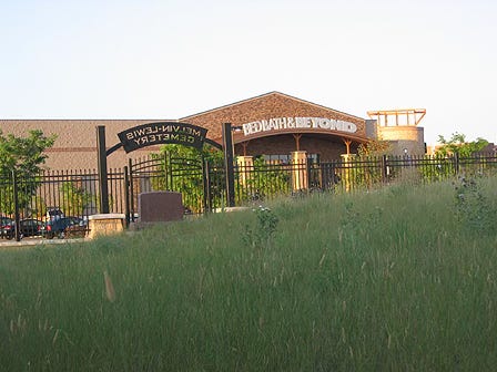 The Melvin-Lewis Cemetery on Parker Road south of Denver, Colorado, conveniently located to provide the dead and the un-dead equal access to shopping (something cruelly ommitted from the Americans With Disabilities Act). Out of camera range, there’s a TGI Fridays on one side and a KFC/Taco Bell on the other, assuring that the dead will not go hungry, either. Score another one for America's great sense of compassion. And thanks to Eli Oldham of Parker, Colorado, for sending it in.