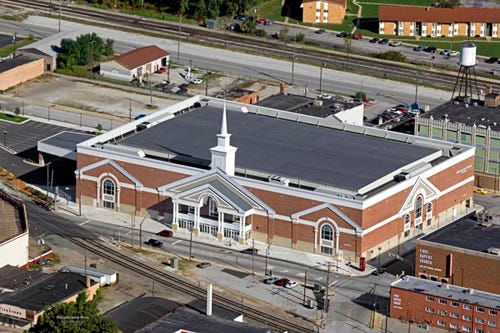 Presenting the First Baptist so-called Church of Hammond, Indiana, serving deep-fried Rotarian-style Christianity in the big box format. The resource fiesta of recent decades allowed idiots like these to go for quantity instead of quality in their buildings. The result: a cartoon of church in a cartoon of a culture in a cartoon of a nation. Meanwhile, the following news-flash came over the wires yesterday: