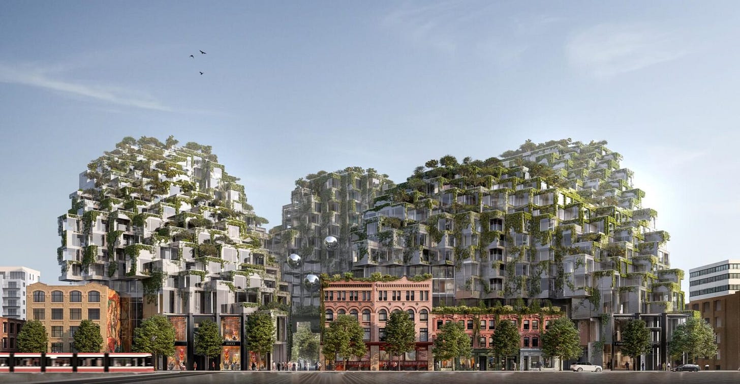 King Toronto is the next step in this fatuous process. Whereas Boston’s “Big Dig” of the early 2000s ended up producing nothing on-the-surface besides a giant ambiguous grassy strip (“The Rose Kennedy Greenway”) instead any new buildings, King Mountain gives you an awesome mini mountain range complete with simulated “forest” concealing offices and flats within. Torontonians can feel morally secure… they are on Nature’s side! They are paying homage to the wonderful places that the city ain’t, the wild country!!! The result of this absurdity is the renunciation of urban form, per se, especially traditional formality as expressed in building tectonics and geometry.