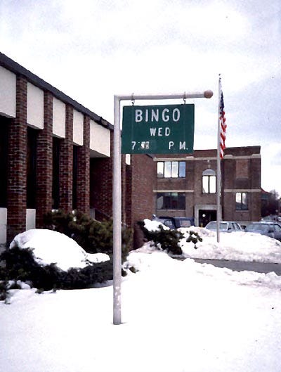 This fetching ensemble brings together the aesthetics of conventional sewer infrastructure with the State DOT's Office of Thruway Signage. Depicted is the front entrance to the Knights of Columbus Hall in Saratoga Springs. In an earlier life, the building was the base of a bowling trophy. The flag in the background is a nice touch. It's secret purpose is to protect the building from criticism.