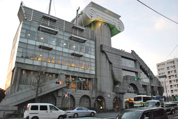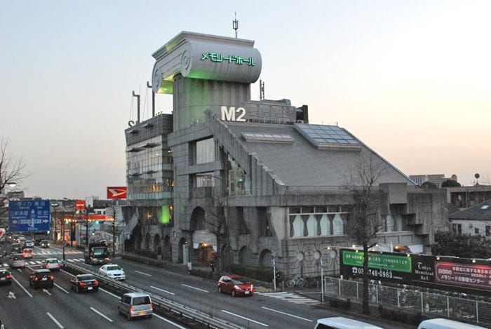 Presenting the M2 building, Tokyo, architect Kengo Kuma, dating from wa-a-a-y back in 1991, a Post-Modernist (PoMo) classic (no pun intended). Indeed, the joke is on all of us, because that's what PoMo was all about. The basic theme here has not changed much in twenty years, only the methods for arriving at that theme – which is the wish to confound the public as much as possible about the meaning and typology of a building and its relationship with the larger culture, not to mention its relationship with the urban fabric generally. Another ongoing theme (or gag) in PoMo was the snide assertion by the architects that amounted to saying: "We're not going to stop being Modernists no matter how much you hate the dreary glass box buildings we provide for you to live your pointless little lives out in... so here's a little joke on all your pathetic memories of a coherently ordered world...." Street scene below: almost makes a body yearn for Atlanta!