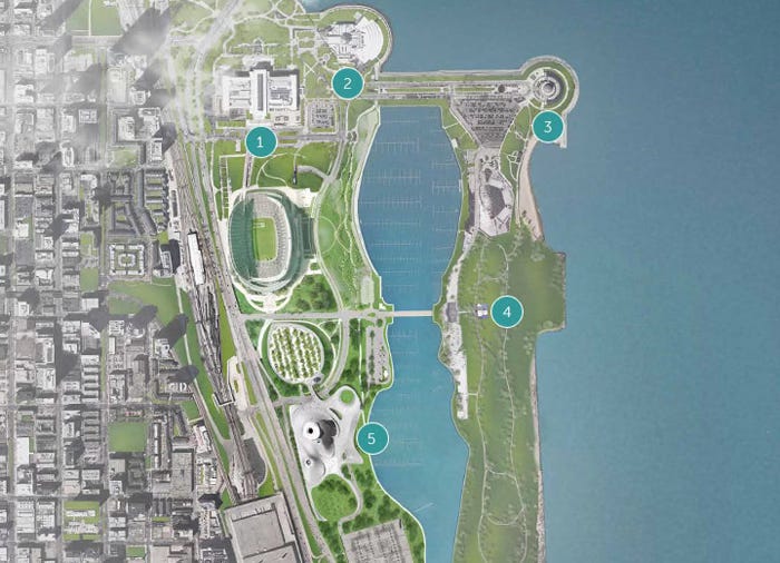 Below is a map showing the growing architectural clutter south of Grant Park. The Lucas Museum site is at Number 5.
