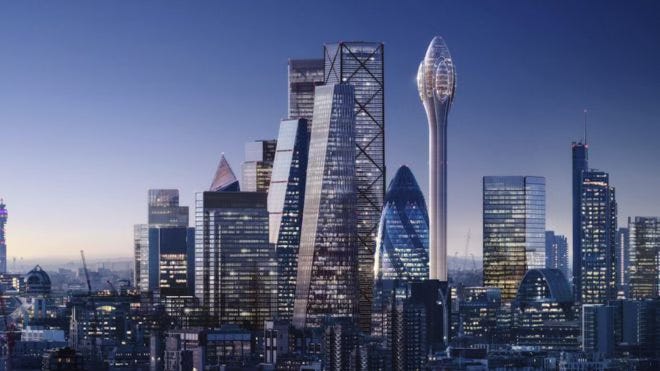Behold London’s latest shwingin’ skyscraper, the proposed “Tulip” designed by starchitect Norman Foster as a companion for the already-built “Gherkin” and “The Shard.” London has decided to make itself a freak show city in these waning days of techno-industrial narcissmo. Obviously, the Tulip’s slender stem does not allow for much office or apartment programming. It’s just a sight-seeing attraction. But have a good look at the scene rendered below for just how unappetizing the experience might be. (Uccchhh….) This is further evidence that empires on-the-ropes put up their most outlandish monuments just before they crash.