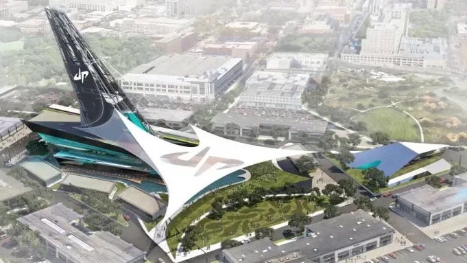 Behold, the Dude Perfect Company’s proposed new headquarters — “Trick Shot Town” — preferably for North Dallas (but actually any other place in the USA that will give them preferential permitting treatment and maybe tax abatement). Dude Perfect is a team of five dudes who formed the Dude Perfect tribe at Texas A & M and built a goofball sports YouTube channel of 58-million subscribers. The project is ten acres: five for the building and five for parking cars and “outside events.” Step right up mayors of America!