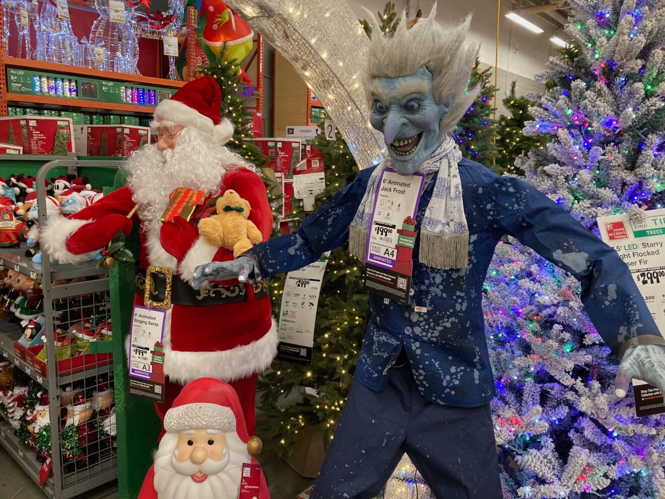 Went to Lowe’s Superstore to buy a water filter replacement for the fridge ($52!) and what should mine eyes behold after entering the joint and turning left into Lowe’s Wilderness of Christmas display — this horrifying effigy representing…uh… what, exactly? A leftover mutant from Halloween’s March of the Misbegotten? No, turns out this is Jack Frost of Western Civ folklore, described variously in literature as: king of the Winter Spirits. . . a kind fellow who wants to help children, whereas a king of a neighboring kingdom, King Winter, is cruel to them (Margaret Canby, 1874). . . a mischievous being responsible for the quieter phenomena of winter [such as] beautiful ice paintings on windows (Hannah Flagg Gould, 1836). . . a playful being who runs around playing pranks (Charles Sangster, 1875). . . you get the picture. Price tag is $199. But it looks like ol’ Jack Frost has evolved, now portrayed as a hedge fund veep stalking out of the Dead Rabbit bar (30 Water Street) after knocking back six appletini cocktails to celebrate a $57-million score on Malaysian mortgage futures. Such is the state of the great holiday in our temporarily psychotic Republic.