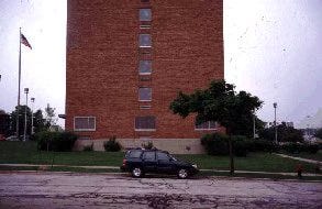 Those three rectangles near the bottom of the building -- they're ventilation grills. Casual passers-by better have a lot going on in their own heads, because in this part of town there's not much stimulation coming from outside. That's why schizophrenics do so well in this sort of environment -- there are few distractions from internal conversations, paranoid delusions, and ecstatic visions of Jesus on a sesame bun. To make it all extra-nice, you get the environmentally-correct deployment of "green space" around the edge of the block. Yippie. Bring out the picnic baskets! The cherry-on-top is the flagpole, a patriotic lucky charm for warding off criticism.