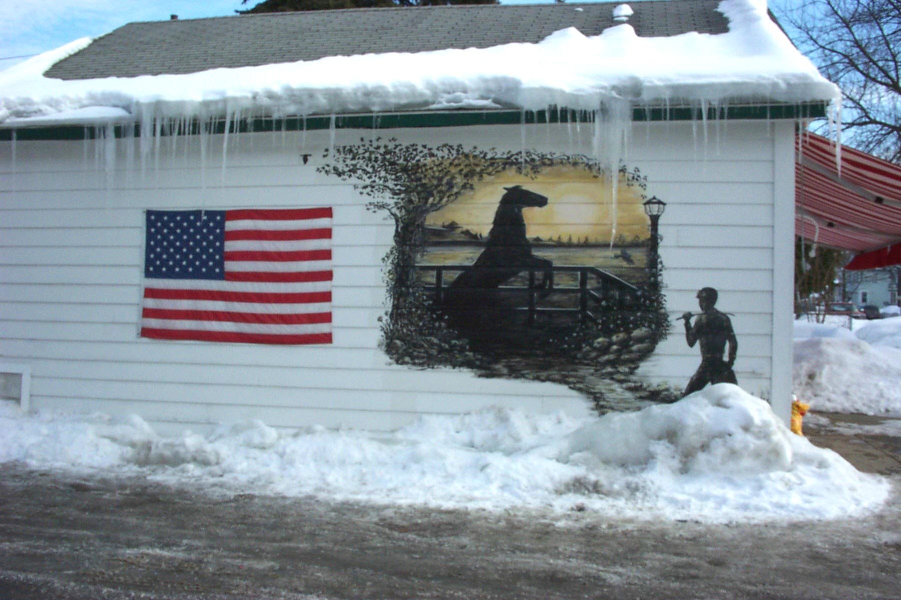 The mural on the side of this corner store In Saratoga Springs is an unfortunate attempt to compensate for the blank wall this little shack presents to the street. In the absence of architectural detail you get television. A close look at the mural yields a vision of amazing weirdness: the racehorse has apparently gotten loose from the paddock and escaped to somebody's lakeside deck as the sun sets radioactively over the distant pines. A menacing jockey approaches brandishing his criding crop. Duck and cover, Seabiscuit!