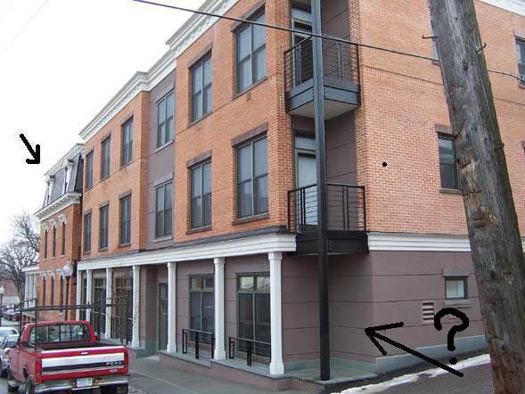 Check out this interesting addition to a bed and breakfast in Saratoga Springs. (Original building at far left.) What's up with that weird indentation on the corner, first floor? Okay, I understand why you wouldn't want another balcony there (and we'll skip over the quality of the balconies above). But why not carry the masonry envelope out to the corner on the base? Actually, what they have succeeded in creating here is a first-class wino drinking nook. It's hidden from any prying "eyes on the street," nicely sheltered from the elements, and excellently scaled for single occupancy. Pass the Wild Irish Rose! Bottoms up!