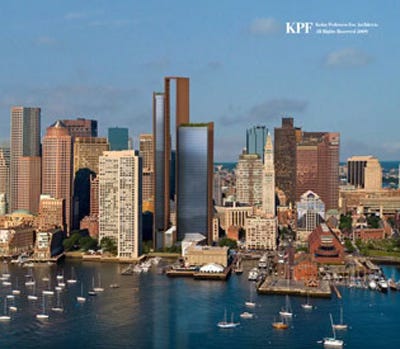 Two skyscrapers joined by a wind acceleration unit proposed by Boston developer Donald Chioferro with Kohn Pedersen Fox Associates, architects, would replace the current aquarium garage. It's hard to overstate what a dumb proposal this is. Of the ridiculous rectangular void between the two towers, Chioferro says, "it's there because it's an elegant sculpture." Mayor Thomas Menino said, in essence, that this piece of crap would be approved over his dead body. Good for him. The mystery is why -- in a catastrophically contracting economy, compounded by a latent energy crisis -- anyone thinks Boston needs almost a million square feet of new office space. Or why, in a disintegrating "consumer" context, there would be any need for more retail. Or why, in an apocalyptic residential real estate situation, anyone would want to bring 120 condos on line.