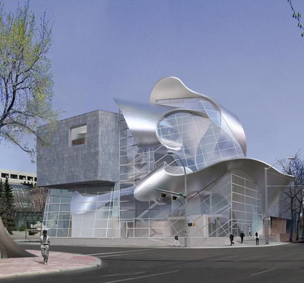 Welcome to the Art Gallery of Alberta in Edmonton, Canada, designed by Los Angeles architetect Randall Stout. Odd, isn't it, how much it looks like dozens of other recent museums and museum additions by starchitects such as Frank Gehry. I guess the lesson here is that the most "innovative" buildings all express exactly the same design innovations. So many geniuses with the same exact thoughts! From a practical standpoint, what we get here is yet another effort to confound the public's expectations about city life and its civic furnishings -- all made possible by the wonders of computer-aided design (a.k.a CAD). Hence, what you also get is a demonstration of the diminishing returns of technology. The more deeply architects venture into the magical cave of techno-grandiosity, the more they fuck up our everyday world.
