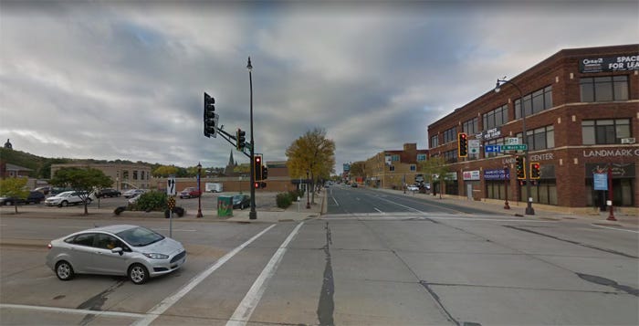 Well, now… here’s something we haven’t seen before: a glass Borg Box with some jaunty angles to liven the darn thing up. This humdinger is slated for downtown Mankato, Minnesota, a town with about as much architectural charm as a 1956 Norge Refrigerator. Note the screenshot below of the current condition of the corner where this UFO is about to land. One thing you have to admire about the rendering: they captured all the fluorescent lighting fixtures so well! These Midwestern clods have been busy destroying their small towns for several generations now. Wait until the buyer’s remorse sets in. Thanks to Matthias Leyrer for the nomination.
