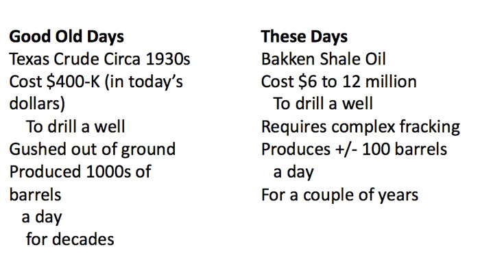 Shale oil and gas amount to an “energy renaissance” that will keep supplies of affordable fossil fuels flowing indefinitely, will make us “energy independent,” and will make us “a bigger producer than Saudi Arabia.” This is all mendacious bullshit with a wishful thinking cherry on top. Here’s how shale oil is different from conventional oil:
