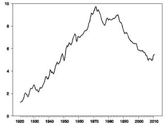 In fact, let’s step back for a panoramic view of what happened with that relationship in recent times: In 1970 you get American peak oil production at just under 10 mmbd (million barrels a day). This chart tells the story: