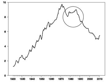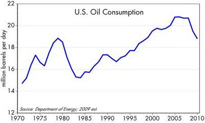 Notice that our oil consumption kept rising from the early 1980s until the middle of the early 2000s. Now look at the circle in the chart below. That rise of production from the late 1970s to about 1990 is mostly about production from the Prudhoe Bay oil fields in Alaska — one of the last great discoveries of the oil age (along with the North Sea and the fields of Siberia). US production did not regain the 1970 peak level, but it put a smile on the so-called Reagan Revolution and on Margaret Thatcher’s exertions to revive comatose Great Britain.
