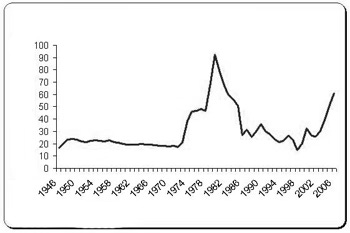 Now look at the price of oil (chart below). You can see what a fiasco the period 1973 to 1981 was for US oil prices: huge rapid price rises in ’73 and ’79. But then the price started to fall steeply after 1981 and stayed around the same price levels as its pre-1973 lows.