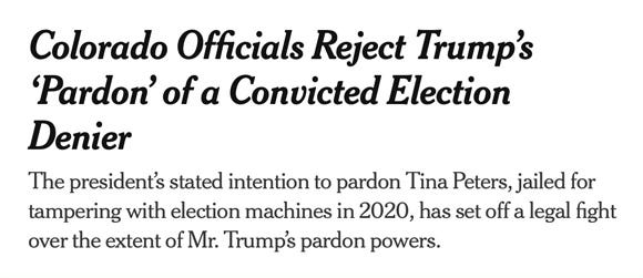 For months, Mr. Trump’s Department of Justice attempted to intervene in the Tina Peters case and, at least, get her moved into a safer federal prison. Colorado officials fought all that. So, last week, Mr. Trump issued a pardon for Tina Peters. There is mixed opinion as to whether a president can pardon anyone convicted in a state jurisdiction. Colorado told Mr. Trump that his pardon will not apply — that they will keep Tina Peters in the state slammer. There are additional considerations as to whether anyone in “Joe Biden’s” DOJ might have unduly participated in or influenced the process that led to Tina Peters’ conviction. . . and, if so, whether that would make a presidential pardon apply.