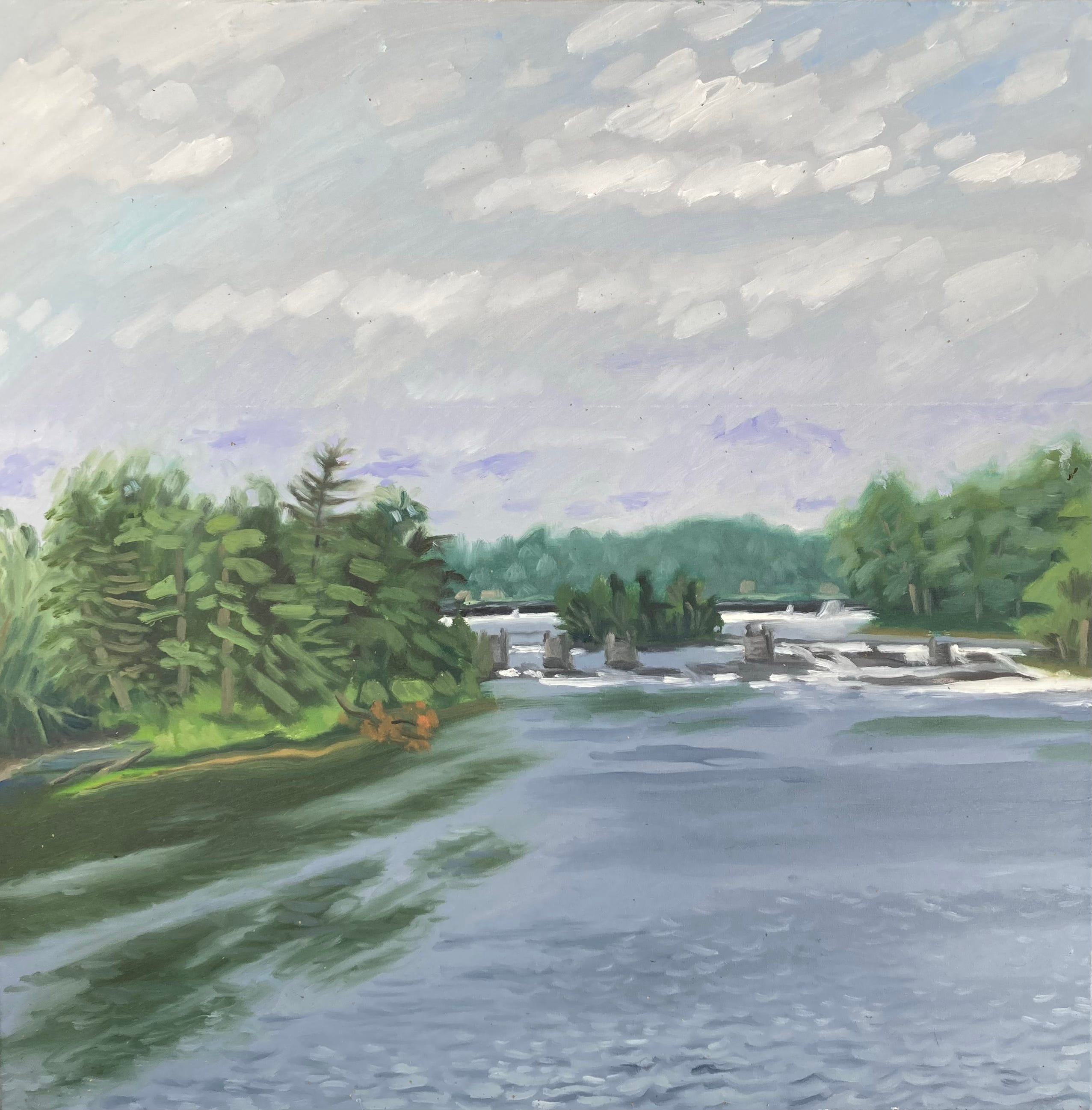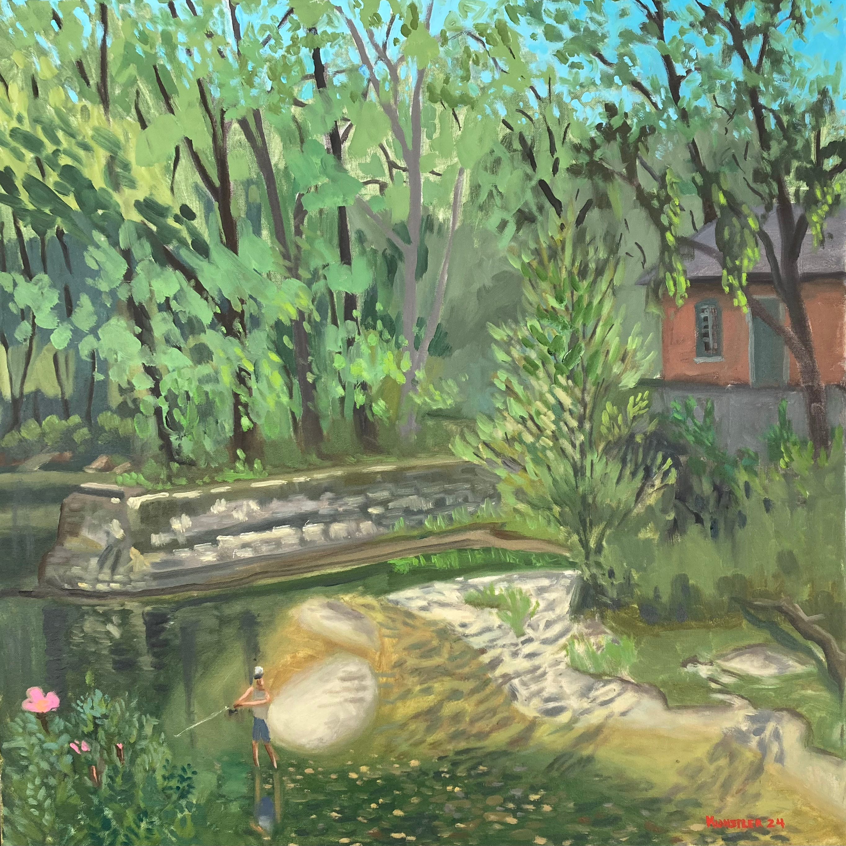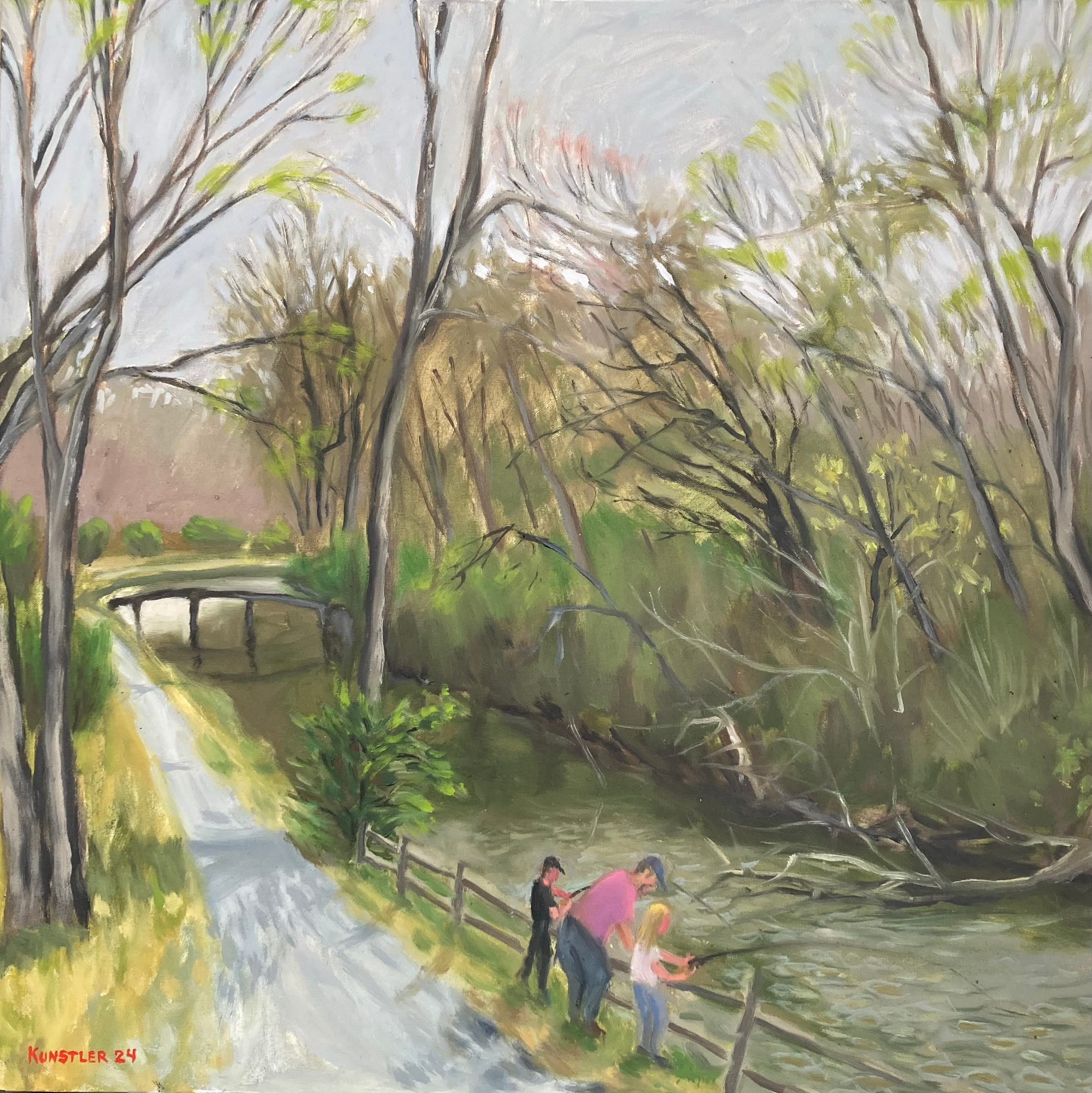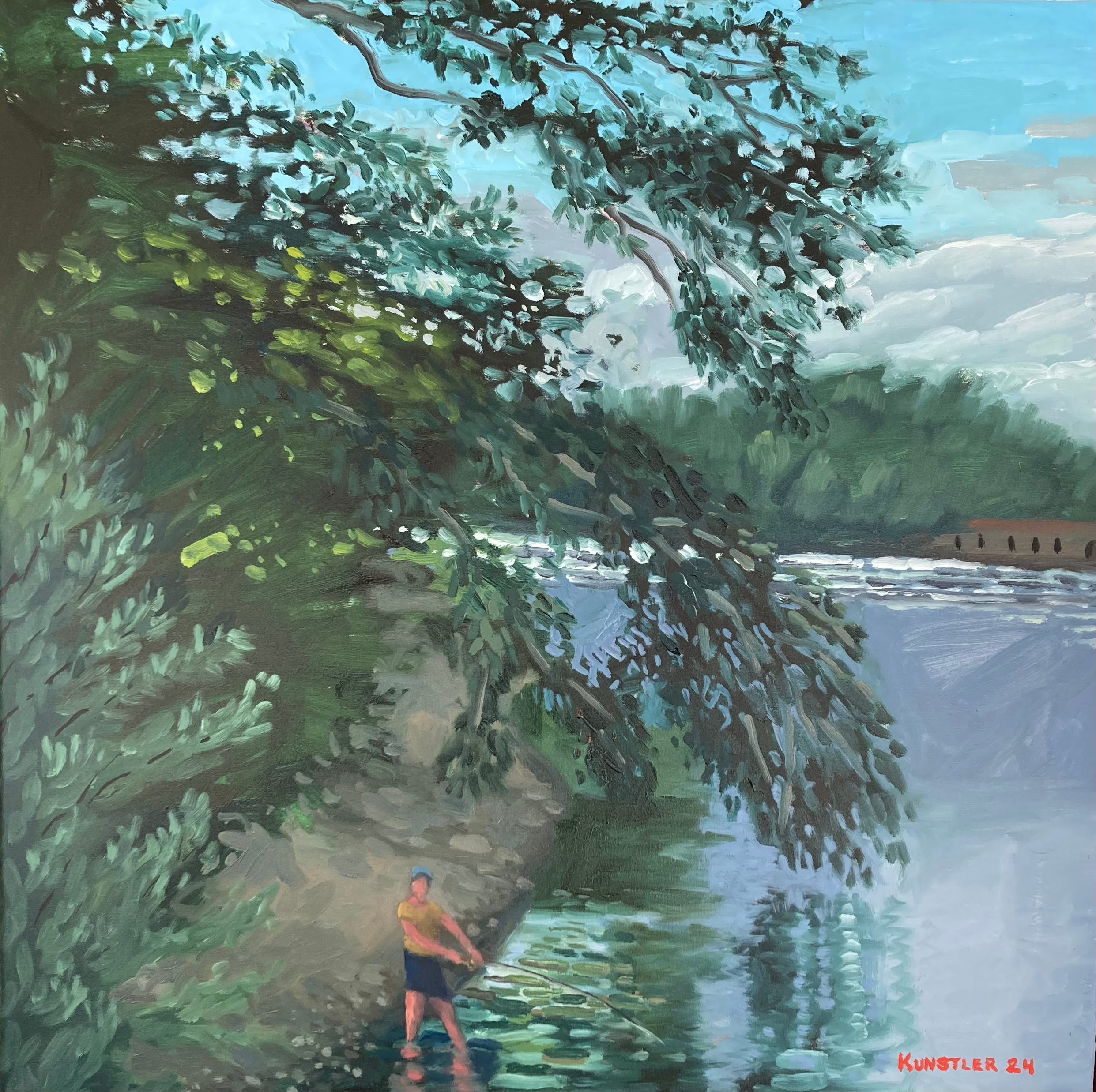 These paintings of the landscape around Washington County, New York, were made in 2024. I hung out often around an island in the Hudson River between the river itself and the Champlain Canal, created originally in the 1820s to bypass the Falls of Northumberland a mile north of Schuylerville. The canal towpath has lately been connected to new walking trails which afforded many opportunities to get human figures in the scene. I often encountered fishermen there. I also haunted a particular stretch of the Battenkill River (tributary of the Hudson) in the hamlet of Shushan, New York, about ten miles east of the Hudson. It is popular with bathers and kayakers.