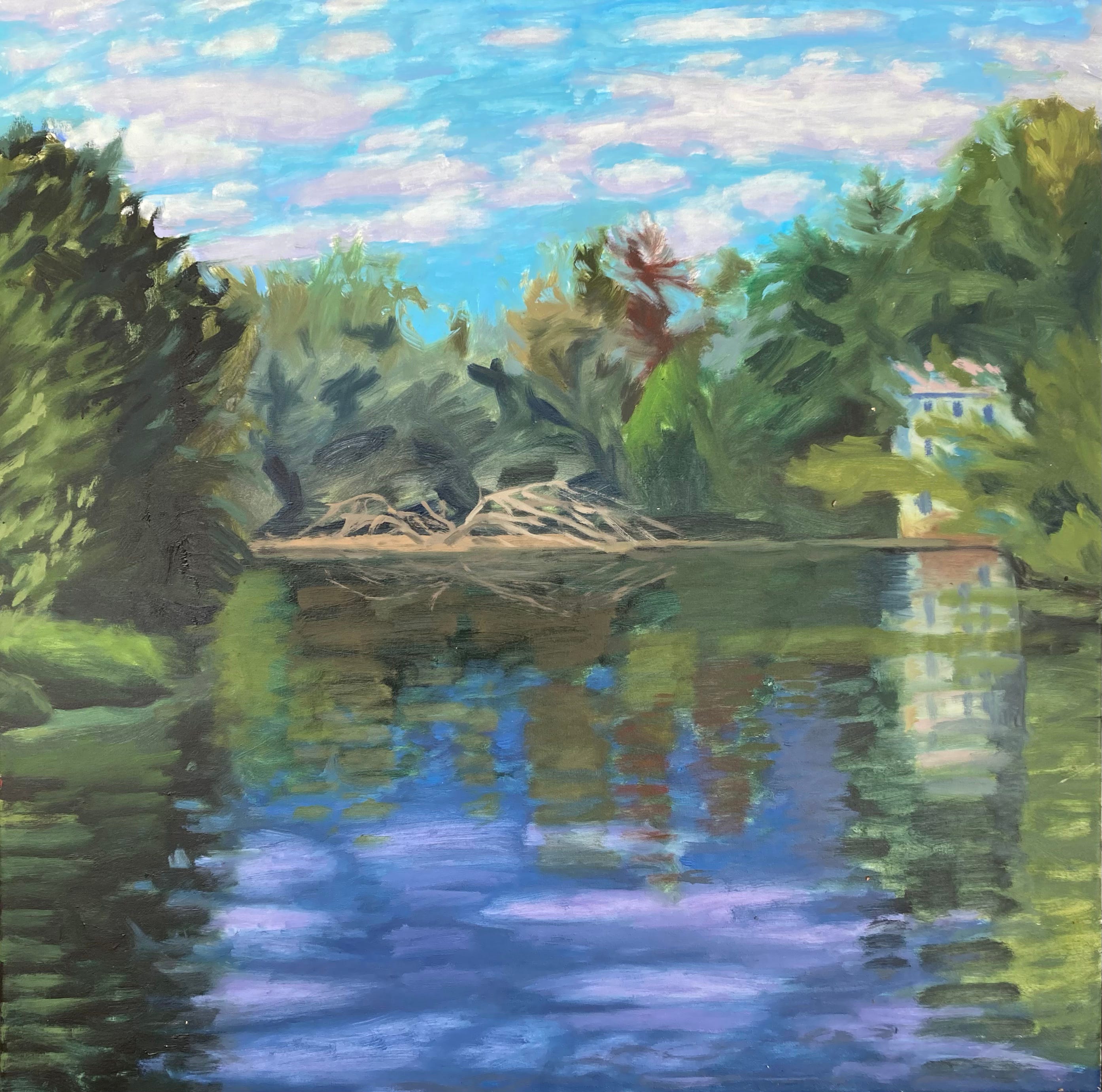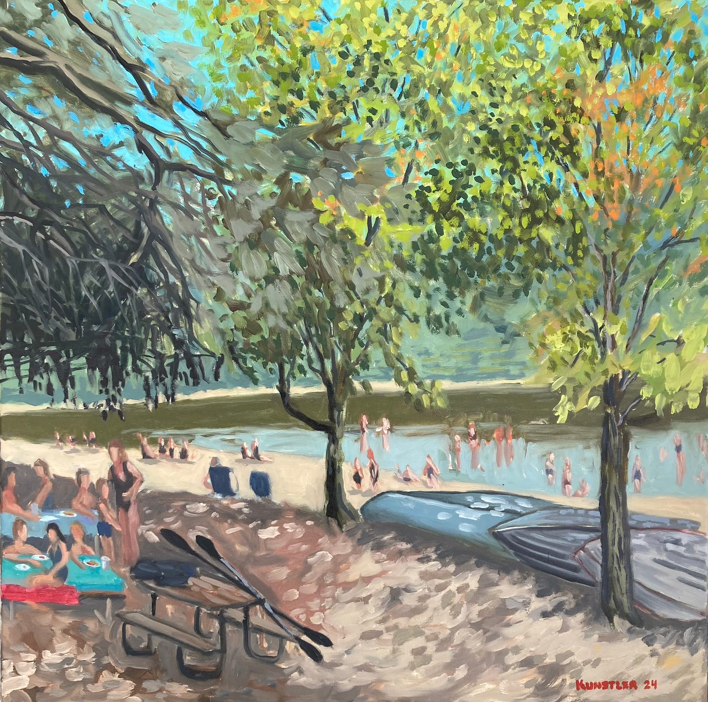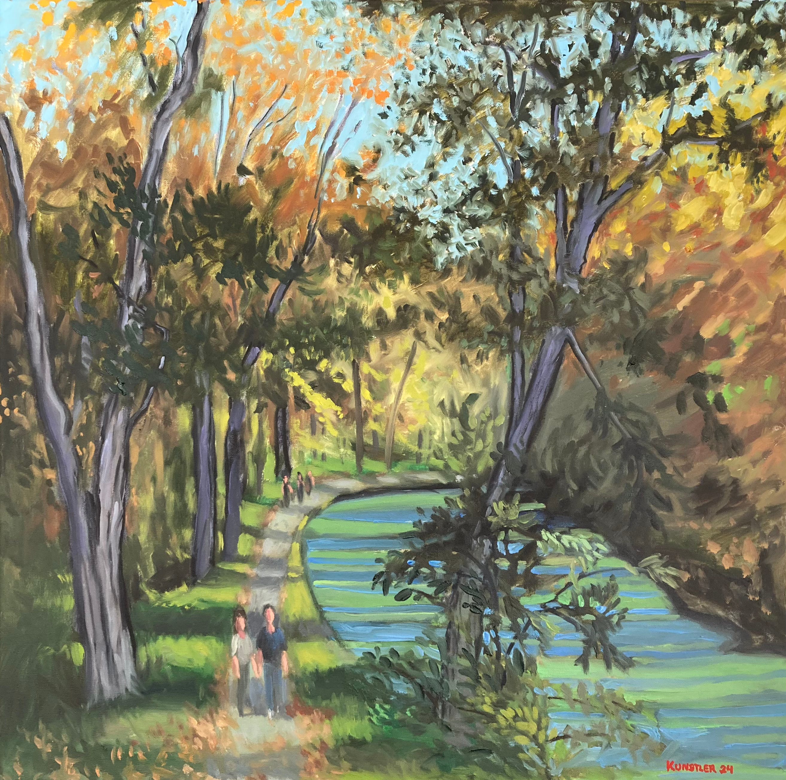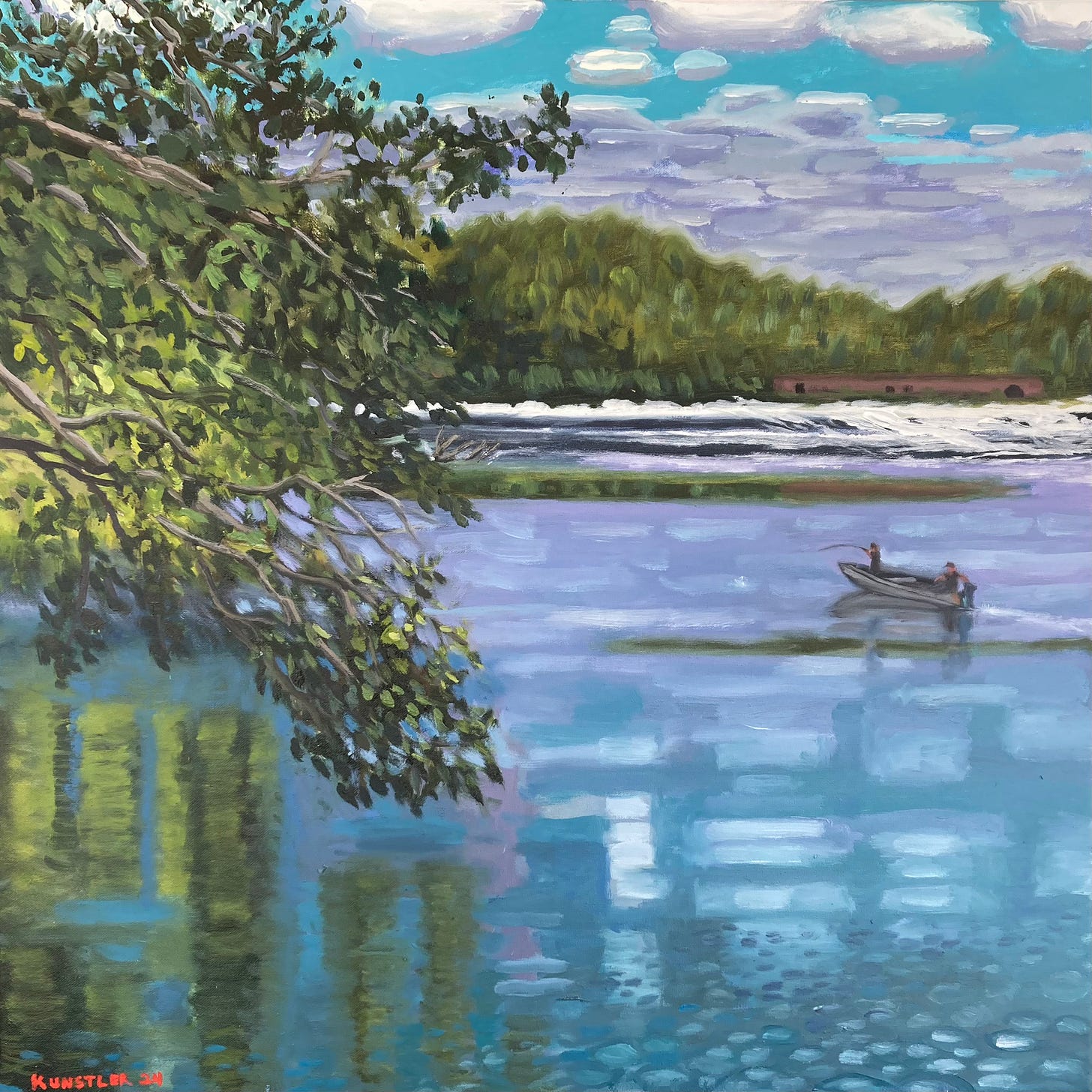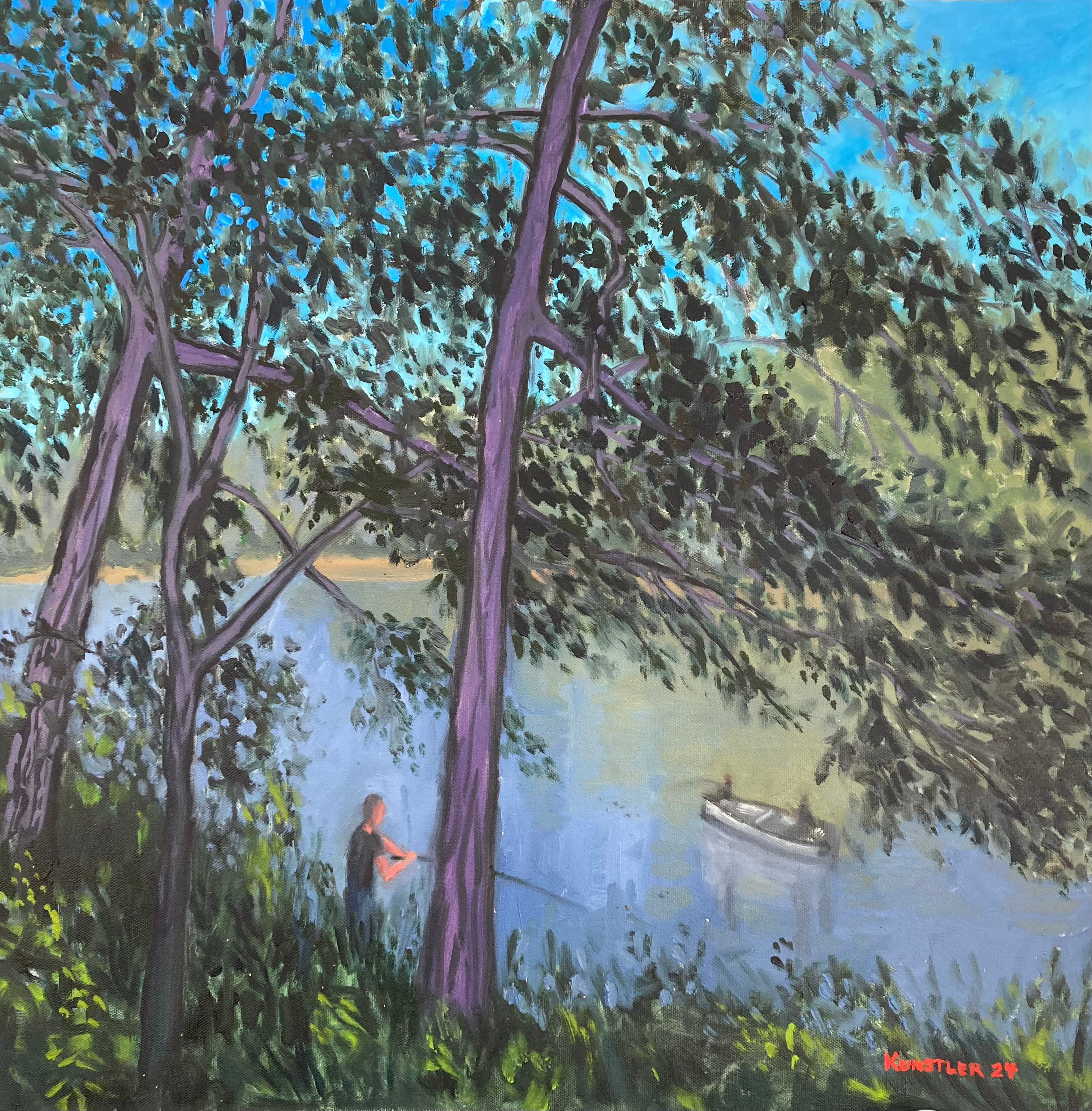 These paintings of the landscape around Washington County, New York, were made in 2024. I hung out often around an island in the Hudson River between the river itself and the Champlain Canal, created originally in the 1820s to bypass the Falls of Northumberland a mile north of Schuylerville. The canal towpath has lately been connected to new walking trails which afforded many opportunities to get human figures in the scene. I often encountered fishermen there. I also haunted a particular stretch of the Battenkill River (tributary of the Hudson) in the hamlet of Shushan, New York, about ten miles east of the Hudson. It is popular with bathers and kayakers.
