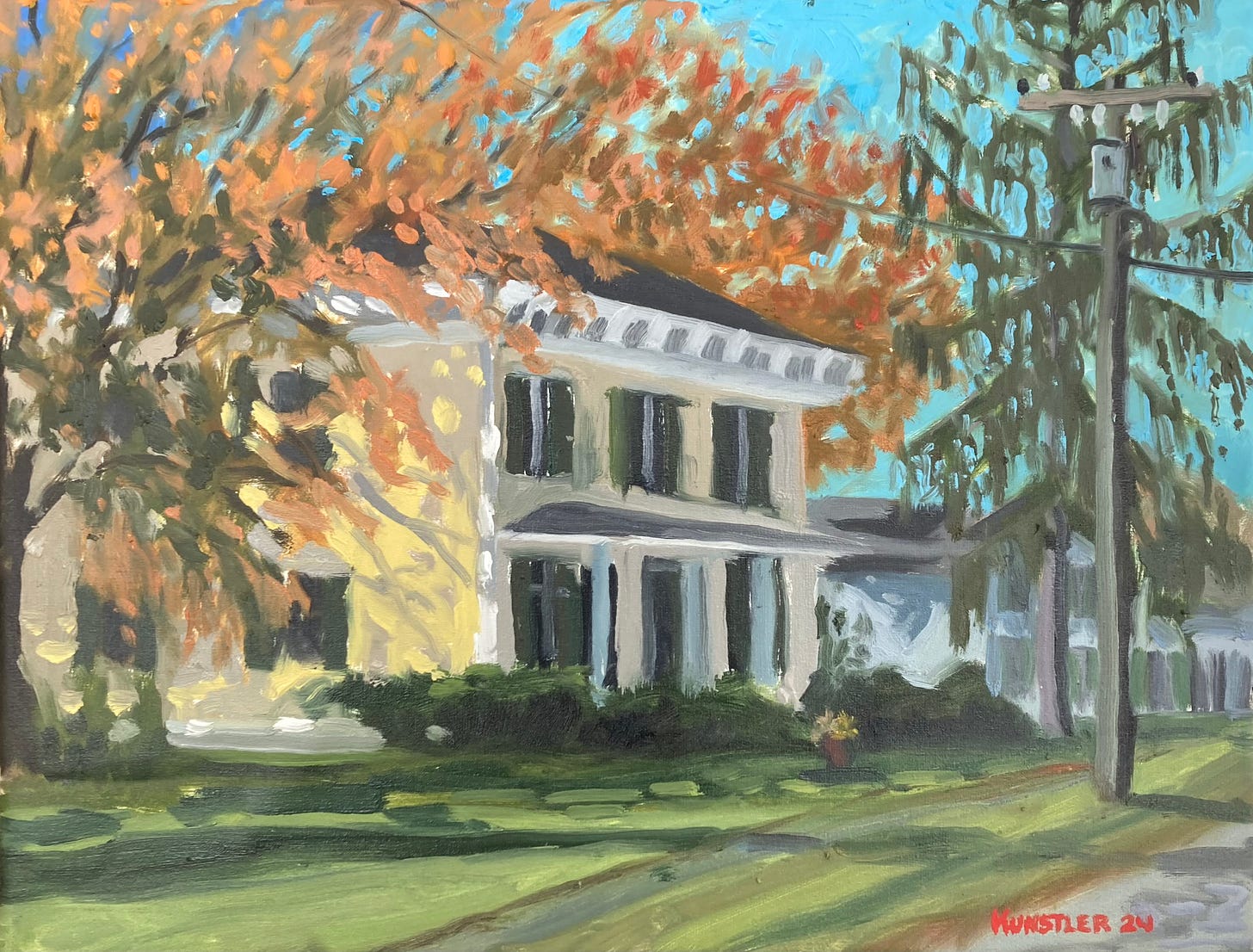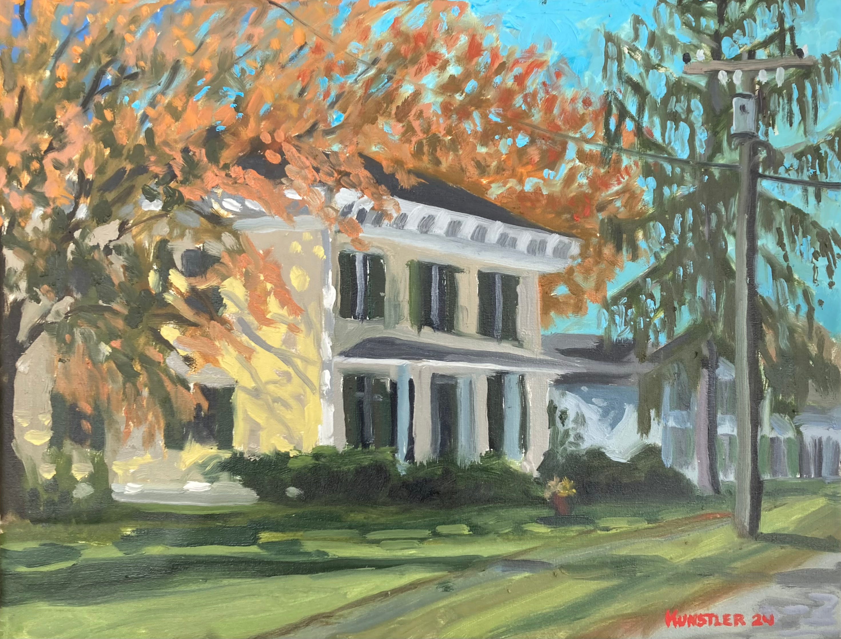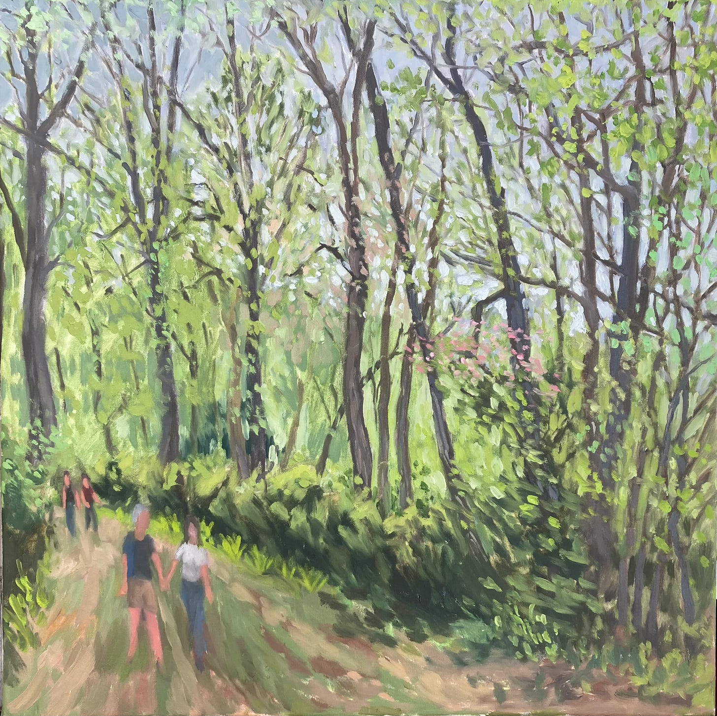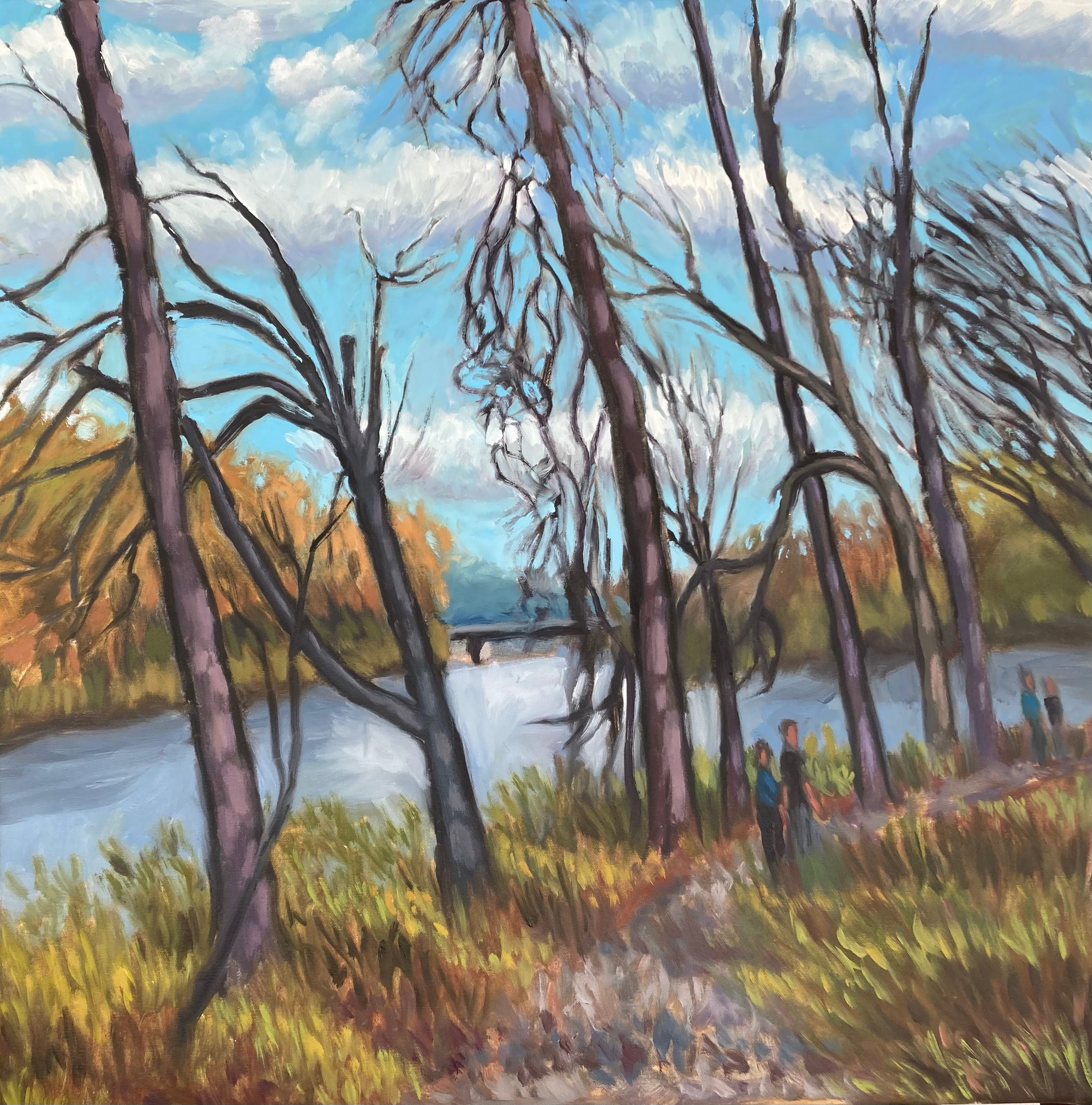 These paintings of the landscape around Washington County, New York, were made in 2024. I hung out often around an island in the Hudson River between the river itself and the Champlain Canal, created originally in the 1820s to bypass the Falls of Northumberland a mile north of Schuylerville. The canal towpath has lately been connected to new walking trails which afforded many opportunities to get human figures in the scene. I often encountered fishermen there. I also haunted a particular stretch of the Battenkill River (tributary of the Hudson) in the hamlet of Shushan, New York, about ten miles east of the Hudson. It is popular with bathers and kayakers.