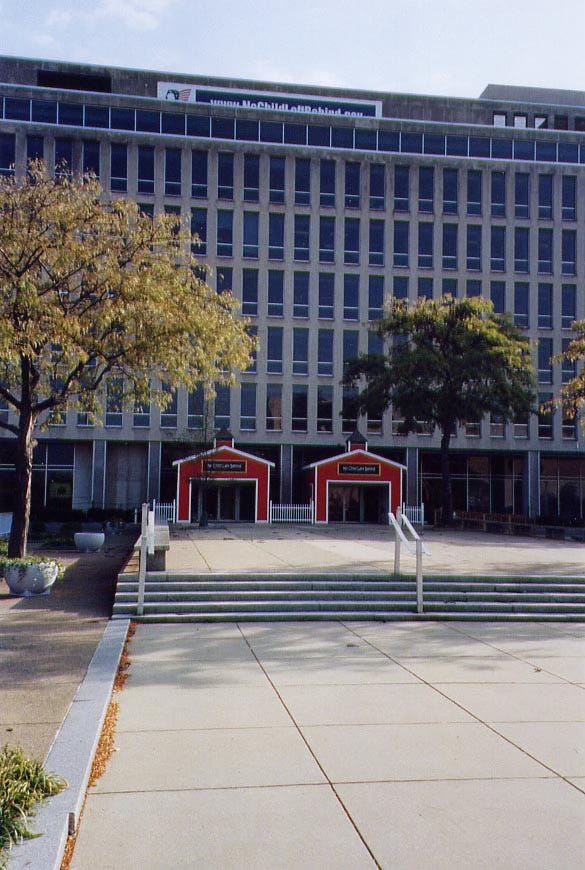 An interesting attempt to "dress up" the Department of Education headquarters in our nation's capital with some signifier of meaning besides the message bureaucrat goldbricks withinwhich is intrinsic to this style of government Modernism. Since we are a people accustomed to televised cartoons, what we get is a little ground floor "skirt" of crudely-drawn old-timey buildings that might be interpreted as little red schoolhouses. Unfortunately the cartoon is so abstract that it could just as easily be interpreted as Red Barn, plenty of horseshit within.