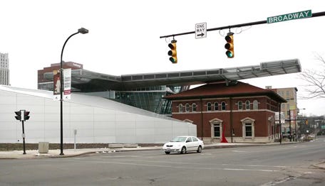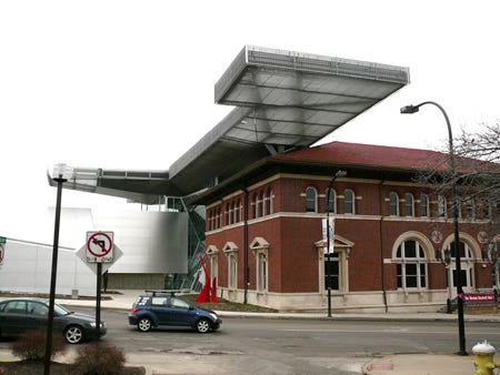 Another American city bends over to pick up the soap for a gang of Eurotrash art theory hustlers. The addition to the Akron Art Museum by competition winners Coop Himmelb(l)au. (That's how they spell it -- cute, huh?). Here's what the designers say about their building: