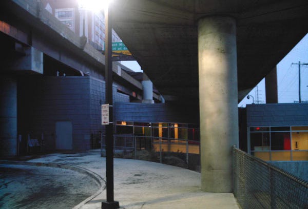 Check out this monstrosity: the new St. Louis Amtrak station, an utterly bewildering piece-of-shit shoehorned under a bunch of freeway ramps behind a UPS depot parking lot. Where's the Prozac dispenser?