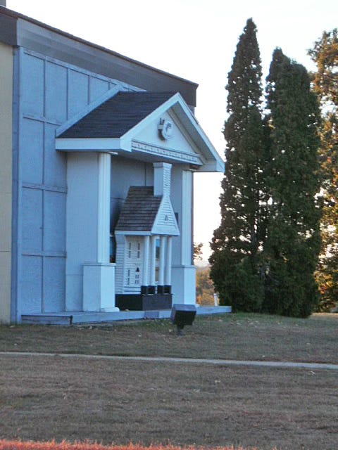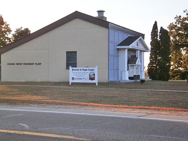 Behold the stylish wastewater treatment plan in Durand, Wisconsin, 30 miles downstream from Eau Claire on the Chippewa River. Notice the interesting placement of the historical marker billboard with the blank planes of the wall, the single window, and the decorative logo — all very Zen gardenish. Of course, the real love was lavished on the front of the building, lest anyone suspect that this is not masterpiece of the Western canon. The building within a building scheme reminds me of the creature in the original Alien movie — a head within a head. Creepy as all get out. Well, this is how its done out in the American heartland. Shout-out to Nik Novak for sending’er in. He writes: “Stately symmetrical entrance? Two sets of Greek pillars? Manicured lawn leading to traditionally conceived, regionally renowned edifice?”
