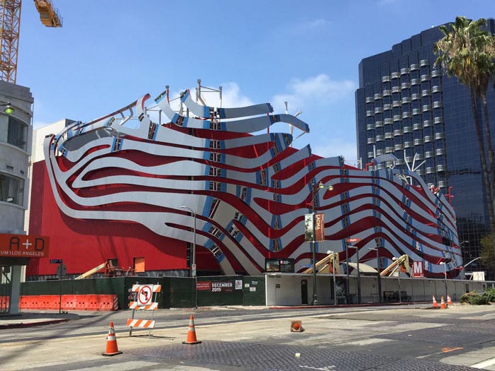 Behold, the renovated exterior of the Peterson Automotive Museum under construction in Los Angeles. We build these horrifying objects because we can. They are enabled by computer aided design (CAD) and the computer aided fabrication of modular construction materials. Sounds like a good deal, huh? Except the diminishing returns of technology never sleep, and in this case they result in the degradation and diminishment of public space. Public space in America mostly comes in the form of the street, and of course the street in America is almost always the tyrannical realm of cars. Hence, it is fitting that a car museum should add to the despotic abasement of public space. Take a gander at the earlier facade of the Peterson Automotive Museum, and below that a rendering of the completed renovation.