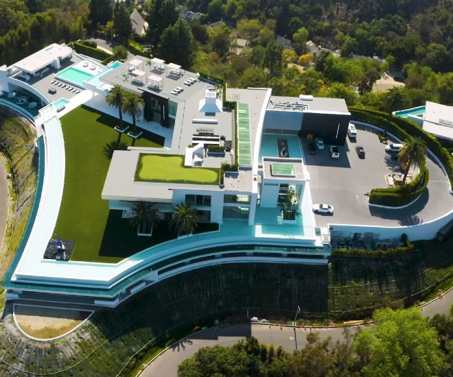 Behold the Bel Air (Los Angeles) real estate venture called The One. (There is no other One… it’s the only One). This exercise in wretched excess on steroids (with sugar on top) is a house, in case you couldn’t figure that out. It’s 105,000 square feet clad in white marble, has five pools, a large nightclub, 40-seat home theater, bowling alley, tennis court, running track, putting green, a 30-car garage, and a moat! All on three little acres. Views of distant downtown LA. One could easily imagine Christopher Walken ranging through the austere chambers with a Glock “Nine,” firing potshots at the art.