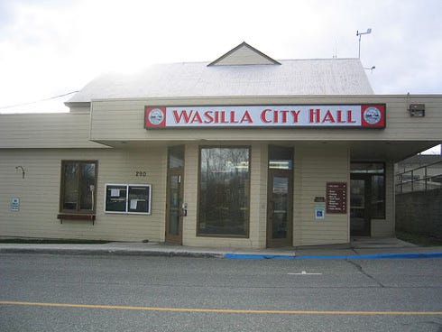 In honor of soon-to-be-former Governor of Alaska, Sarah Palin, we present her hometown's seat of government. Like many public buildings around small-town America these days, this one was built with next-to-zero thought or care. It expresses a notion of democracy as like unto a take-out hamburger -- and many of you may be thinking... yes, that is exactly what it has come to! Of course this leaves out one the more interesting parts of the American ethos: to aspire to something finer. And to express these aspirations in our buildings. One might conclude that we're fresh out of aspirations. Have a happy holiday everybody!