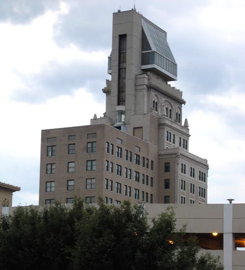 Presenting the Lamar Building, Augusta, Georgia. The original Beaux Arts structure dates from 1913. The "penthouse" was added in the 1970s – designed by eminent architect I.M. Pei. Thanks to correspondent Tom Tomaka for sending. He writes: "Yesterday while visiting Augusta, GA I stumbled out of dinner and thought I was suffering the effects of too many Rob Roys.... If it was already so classic and impressive, why did they put a helmet on it?"