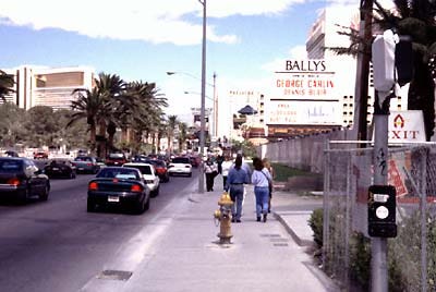 Behold the fabulous new pedestrian friendly street-scaping of the Las Vegas Strip -- America's favorite new "family" vacation spot. The generous sidewalks are conveniently placed next to the travel lane to assist the suicidally inclined. Note the thoughtful placement of the fireplug and the decorative chain-link fencing. The street trees are in just the right position, too, for those 125 degree summer days.