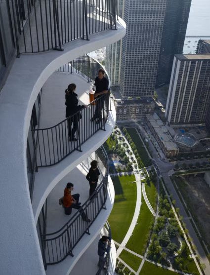 Behold the Aqua Tower by architect Jeanne Gang, Chicago. Of course, the skyscraper is an obsolete building form because the ones we’ve already got will never be renovated in the coming era of resource and capital scarcity. But that doesn’t stop the developers and architects from creating new ones — especially at this climax moment of the turbo-industrial economy. Remember: societies create their biggest monuments just before they roll over and swoon. Now, the reason the developers and architects do this is because they can’t resist the temptation to maximize the floor-to-area ratio of the building lot. That is, to stack as many salable or rentable units over one plot of land. Everybody makes more money in the short term. In the long term, society is left holding the bag in the sense that the building ceases to be an asset and becomes a liability for the city. In the case of this monstrosity, that will happen when the need for major renovations arrives. All buildings are faced with this. As a living organism, the city needs buildings that lend themselves to adaptive re-use, which these skyscrapers do not. The PR bullshit for this building crows about LEED certification and having one of Chicago’s “largest green roofs.” In fact, there is nothing sustainable about this building. It’s just a way of leveraging the future for short-term gain.