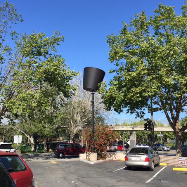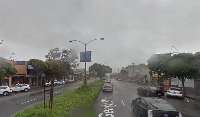 Megaphone to distant alien civilizations? No, just a decommissioned Kentucky Fried Chicken bucket on San Francisco’s Geary Boulevard. Rather than scrap it, they transformed it into “street art.” (Probably would have been cheaper to take it down.) Geary Boulevard is one of the more remarkably depressing thoroughfares in urban America, considering that the city is among the top five most expensive places to live in the USA. Below: lined mostly with one and two story buildings of no discernible design aesthetic, it’s every bit as bleak and futureless as the Happy Motoring wastelands of Los Angeles.