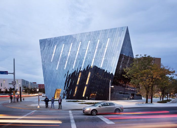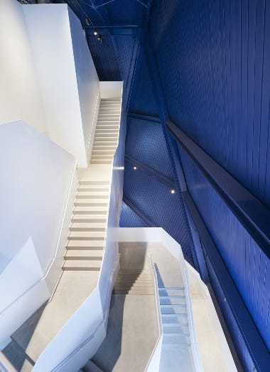 Behold the new Museum of Contemporary Art (MOCA), Cleveland, Ohio, designed by Iranian-born, London-based, Farshid Moussavi. Yet another borg building? Why, of course. That is how museums of the newest “art” must be designed, as decreed by the hive-mind of the High Culture insiders. They must be entirely and absolutely unoriginal! They must conform to the ideology of the cutting edge, meaning they must be baffling, disorienting, devoid of semiotic content — besides a sinister suggestion that unwholesome things are contained within. Moussavi says of his building: Moussavi says of his building: “Our design for MOCA Cleveland aims to provide an ideal environment for artists and visitors and to foster creativity and variety in exhibitions and programs.” I dare anyone to be offended by that! The slanty windows are a cute touch. And you’ve got to love that little mouse-hole door. The slanty windows are a cute touch. And you’ve got to love that little mouse-hole door. Oh, get a load of the interior, below: the stuff of sci-fi nightmares. MC Escher Meets The Day the Earth Stood Still. No humans to ruin the picture, either.