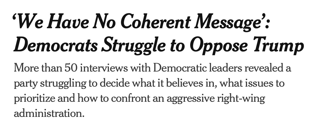 “In private meetings and at public events, elected Democrats appear leaderless, rudderless and divided. They disagree over how often and how stridently to oppose Mr. Trump. They have no shared understanding of why they lost the election, never mind how they can win in the future.” — The New York Times