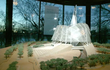 Here's a humdinger: a model of Canada's new Museum of Human Rights in Winnipeg. Ever been to Winnipeg? It's an entire city built to the specifications of a 7-Eleven shop, with about as much artistry. It could use a little self-esteem boosting. They need something to feel good about. (As we all know, feeling good is the same as being good.) So, now they are going to "gift" themselves with a building that looks like a wad of discarded scotch tape representing a feel-good theme that nobody can be against. The architect is Antoine Predock (who has appeared in these pages before). You have to wonder, though: if human rights are now in a museum, does that mean that they have become a mere artifact of history?