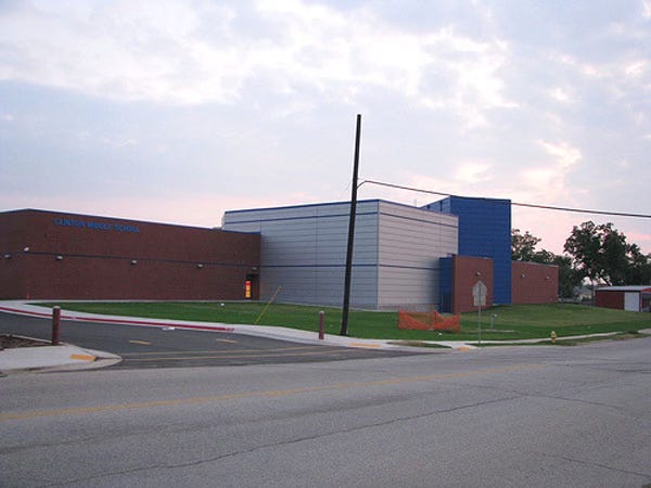 Presenting the new Clinton Middle School, Tulsa, Oklahoma -- a building that expresses to perfection our current social consensus about the meaning of education. It stares balefully at the street with the blank-faced demeanor of an autistic child preparing to explode in violent rage. It summarizes our collective aspirations about school as the unidentifiable contents of an inscrutable set of boxes. This is one of the reasons that public education is failing so desperately. Also, keep in mind the colossal scale of the capital investments we're making in these terrible new buildings. They will bankrupt us even as they rapidly fail as institutions.
