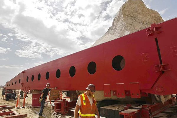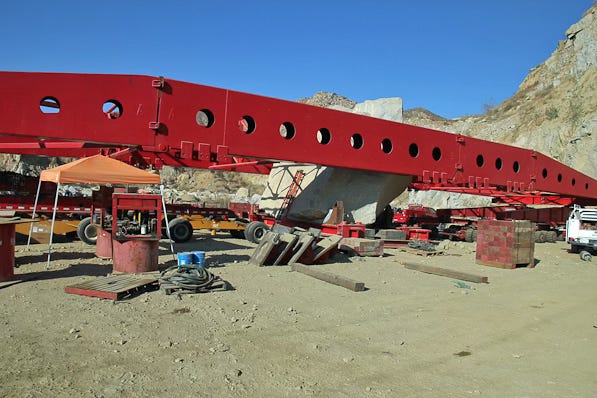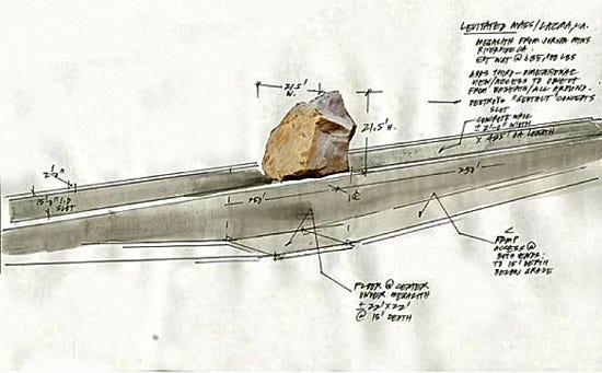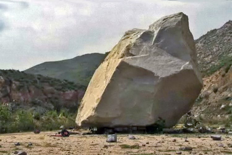 Techno-grandiosity meets exercise in futility: an art installation, so-called, by Michael Heizer titled Levitated Mass. This stunt involves moving a 340 ton boulder from the edge of the desert at Riverside, California, to a display site at the Los Angeles County Museum of Art by means of a gigantic steel conveyor vehicle.