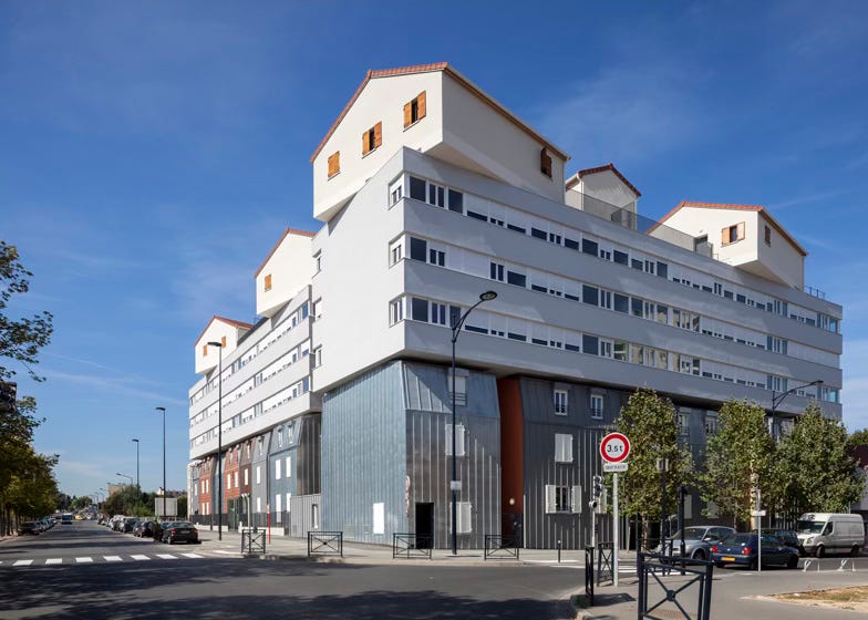 Get a load of this beauty. Social housing on the outskirts of Paris by the architectural firm Maison Edouard François. The awkward galumphing colossus manages to employ every schlock gimmick from the PoMo and DeCon playbooks: the homage to industrial banality, the confusion of building typologies, the arbitrary change of cladding materials, the ironic "squashing" of the "row houses" along the base (to make the point that gravity is a joke), the iconic horizontal window bands and flat roof, and the cartoon treatment of the bungalows perched playfully askew on top. The objective of this stunt-obsessed architecture is to confound our expectations about the urban habitat and the things in it, under the theory that life is not suffficiently anxiety-provoking -- so architects must supply more of it. Absent are the elements really needed in the urban setting: decorum, legibility, scale that will afford adaptive re-use over time, and a ground floor that shows some generosity to public life.