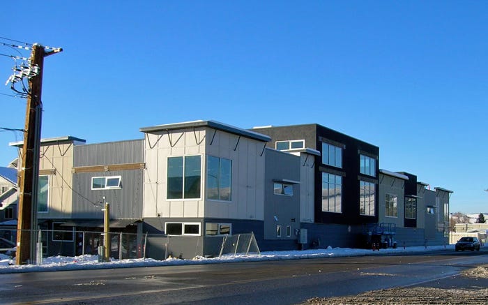 Behold the new Health Center on Russell Street in Missoula, Montana — a demonstration that Murphy’s Law rules absolutely in American architecture and town planning. This is the back of the building; the front is oriented to the interior of the block where the parking is (don’t expect Happy Motoring to continue ten years from now). It’s a little hard to see here, but all the HVAC blowers face the narrow sidewalk where hypothetical pedestrians will get hot blasts of locker room exhaust as they journey down the street. The chief tenet of modernism still prevails: justify cheap shortcuts, bad proportioning, absence of ornament, and shoddy construction with ideological minimalism. Note the attempt to make the giant box appear to be be composed of separate smaller buildings. Note the crappy horizontal windows. Note the weak gestural brackets along the cornice. This culture is incapable of doing better work. We became a third-rate nation before we became Third World.