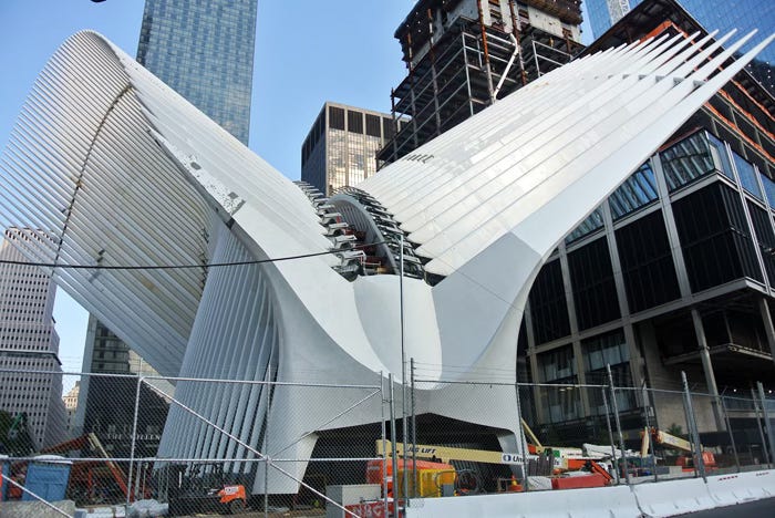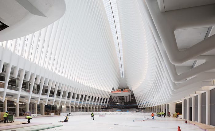 Behold! The Raptor has landed! Hail Santiago Calatrava’s World Trade Center Transportation Hub, with its grand opening this month. Starchitecture’s latest bowling trophy is less huge (yuge-uh!) than it looks. Check out the scale of construction vehicles at it’s beak end (or is that cloaca?) Cost $4-plus billion. It is not, by the way, New York City’s main train station. That distinction is shared by the enduringly grand Grand Central Station and the subterranean latrine known as Penn Station. This new “hub” is just an entrance to the Jersey-bound PATH trains and a bunch of converging subway lines that boil down to it being the city’s “18th-busiest subway stop” (NY Times) – which isn’t saying a whole lot. No doubt the project was cooked up in the same spirit of paranoid jingo-narcissism as the grandiose POS known as “Freedom Tower” put up in the aftermath of the 9/11 attacks to provide a fresh target for the aggrieved peoples of the world. Below is the acclaimed interior, dubbed “the Occulus” — a reference to the skylight on the raptor’s curved spine. The result is a sterile, boring, vacant chamber (soon to grow dingy) for Wall Streeters to throw parties (a.k.a. an “event space.”) Remember: history is a prankster. With the banking / finance system heading south this year, and the political parties blowing up, and the USA heading into a terra incognita of social disorder, imagine how the raging 99-percenters will treat the partying Wall Streeters in their event space. Duck and cover, Goldman Sachsers!