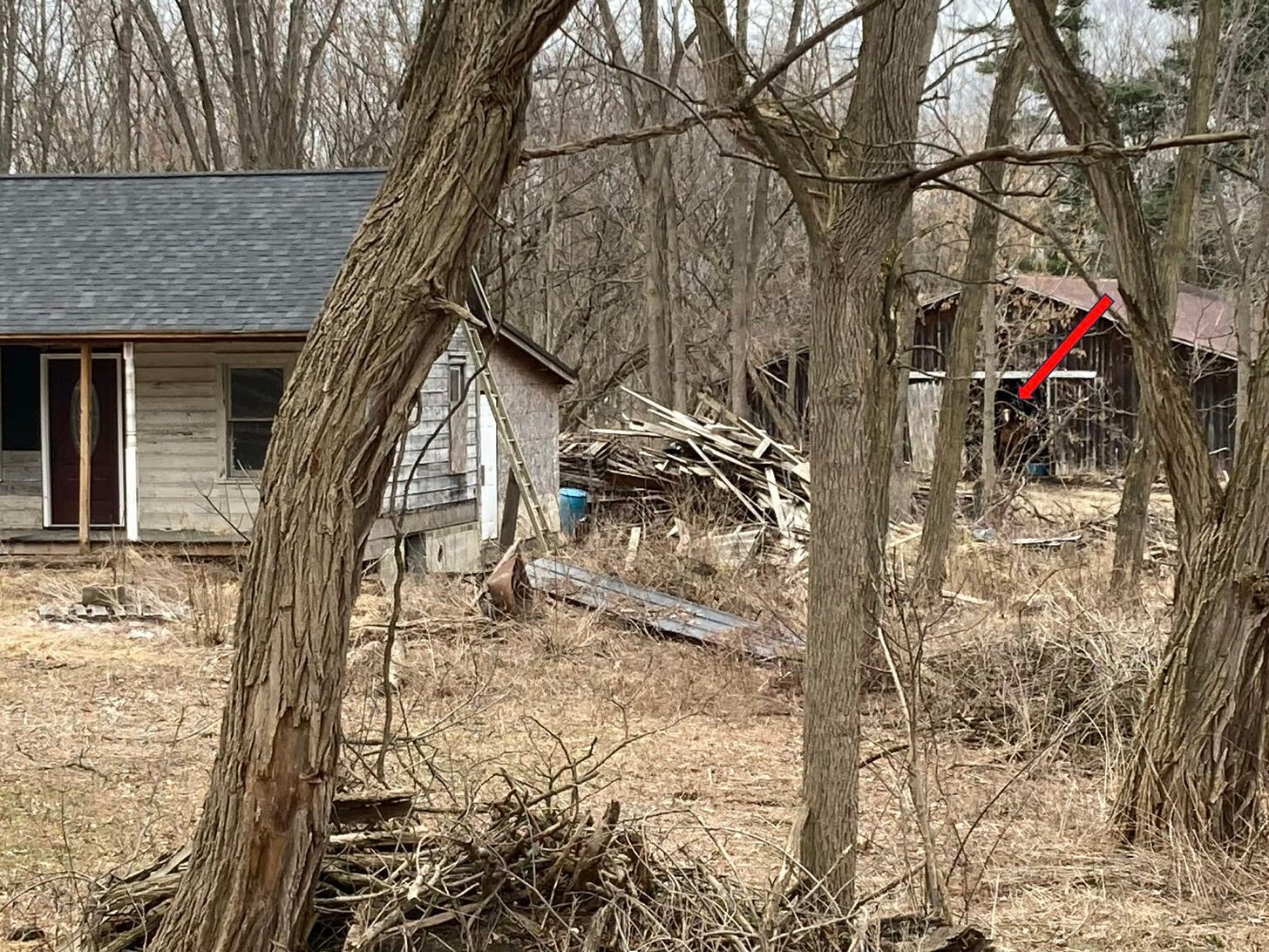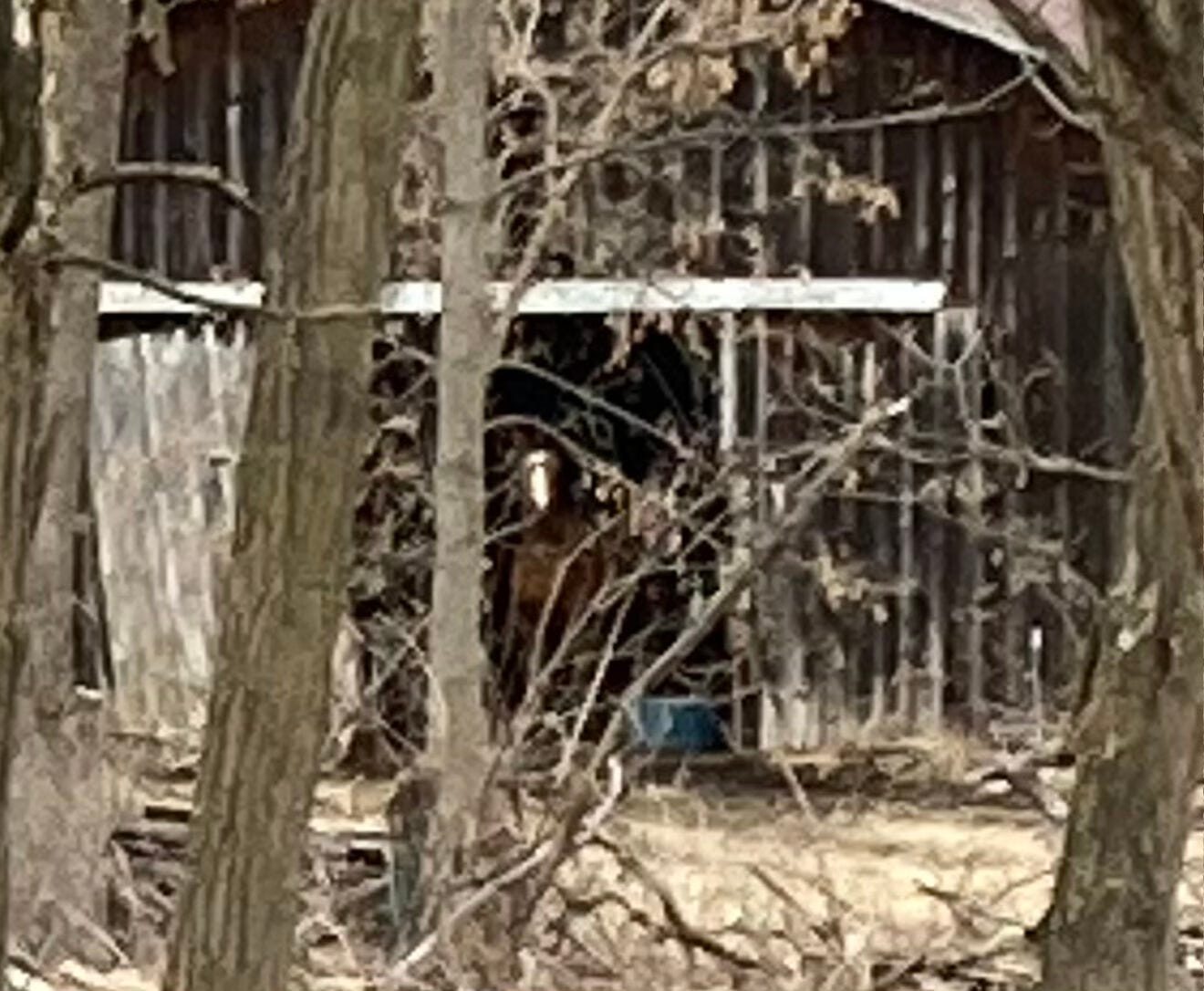 The red arrow points to the horse that lives on the property. Her name is Angie. She is 29, which is quite old for a horse. Angie has easy access to about five acres of pasture that slopes down to a small pond about 100 feet across. Some days she hangs out in the barn and watches the action on the road. She used to have a companion horse, but the companion died two years ago and now Angie is alone. A lady comes over here regularly and brings Angie hay and grain, and brushes the cockleburs out of her mane. I used to bring Angie carrots, but she has lost some teeth, and I can tell it hurts her mouth to chomp them. Lately, if she’s anywhere near the road, I just go down to the battered fence and give her a few strokes along her cheek muscle. She seems to appreciate that more than the carrots.