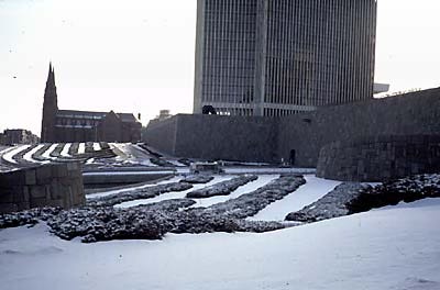 Calling all orbital interceptors! A UFO has landed in Albany New York and hijacked the state government! You are looking at the billion-dollar Empire State Plaza (1974 dollars, that is) sponsored by that champion of Modernism, Gov. Nelson Rockefeller. Can you believe that the sales pitch behind this architectural abortion was "to re-connect the state government to the city of Albany?" That's rich, huh? Forget the streetcars, bring on the seige engines!